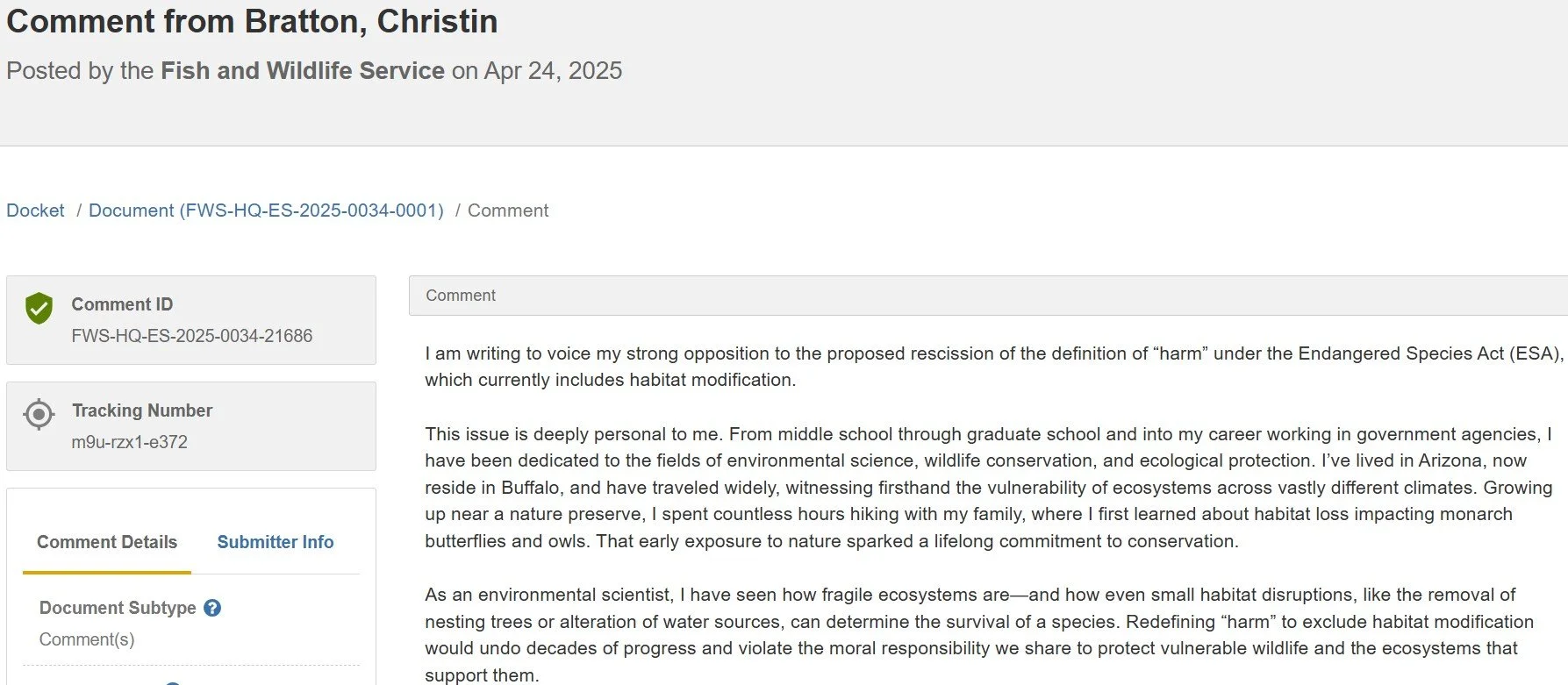 My submitted comment focused on regulatory consistency and enforcement risk. I emphasized that narrowing the definition of harm would create enforcement ambiguity and increase uncertainty in project review processes.